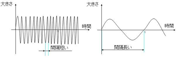 波の間隔が短いもの(左)が高い音、波の間隔が長いもの(右)が低い音となります。