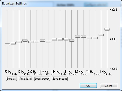 例えばfoobar2000のイコライザ。下に周波数が書いてあって、その周波数の音の大きさ[dB]を調整できます。左側が低い周波数(低音)、右側が高い周波数(高音)になります。