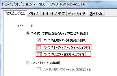 「ドライブオプション」の「取り込み方法」タブを開きます。