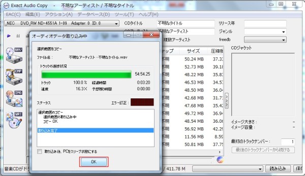 保存場所を指定すると音楽CDからオーディオデータの取り込みが開始されます。
