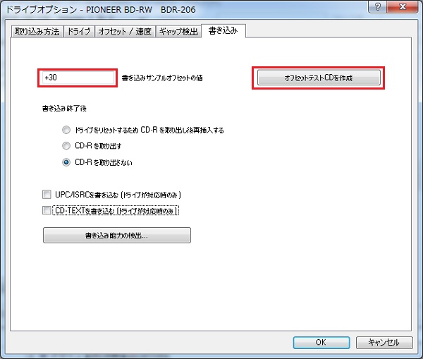 方法としては「書き込みサンプルオフセット」を使ってオフセットテストCDを作成し、