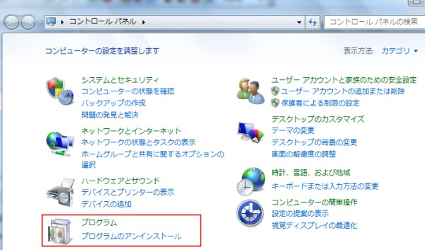 プログラムのアンインストールをクリックします。(XP等では「プログラムの追加と削除」)