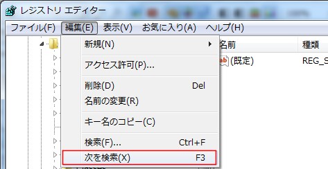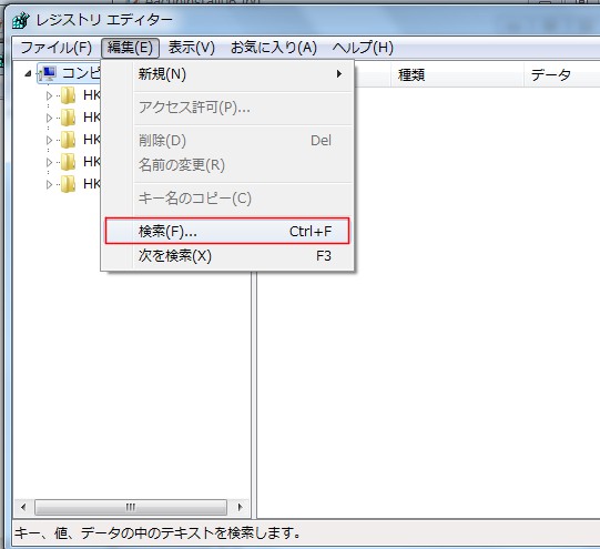 レジストリエディターが開きますので「編集」−「検索」をクリックします。