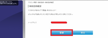 事前登録確認でメールアドレスを確認して登録をクリックします。
