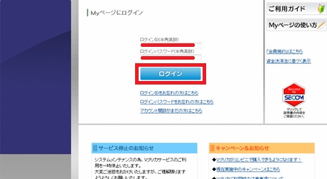 先ほどのメールに書かれていたログインIDと登録のときに入力したパスワードを