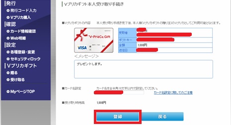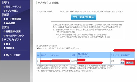 Vプリカギフトの贈るのページで「再送」と「本人受取」が選べますので