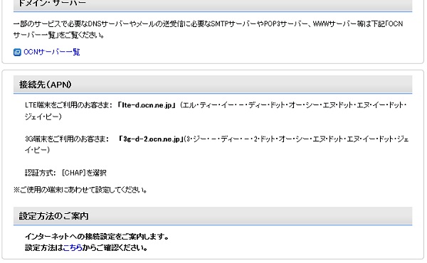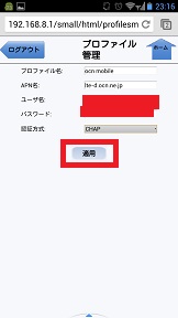 プロファイル名は適当につけます。後はOCNの申し込み画面の最後に出てきた情報を入力します。APN名にlte-d.ocn.ne.jp