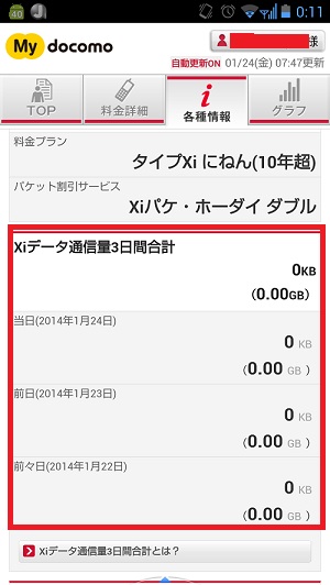 最終確認はMy docomoでXiデータ通信量3日間合計が0KBになっていること、料金が