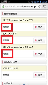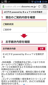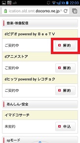 契約内容のページを送っていくと音楽・映像配信の欄にdビデオ、dアニメストア、dヒッツがあります。ご契約中という表示になっています。「解約」をタップします。 |