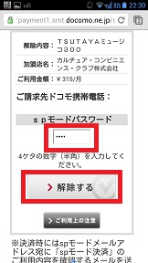 | ようやく決済画面に来ます。spモードパスワードを入力して「解除する」をタップします。 |