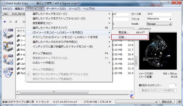 「アクション」ー「CDイメージをコピーしCUEシートを作成」ー「圧縮」をクリックします。