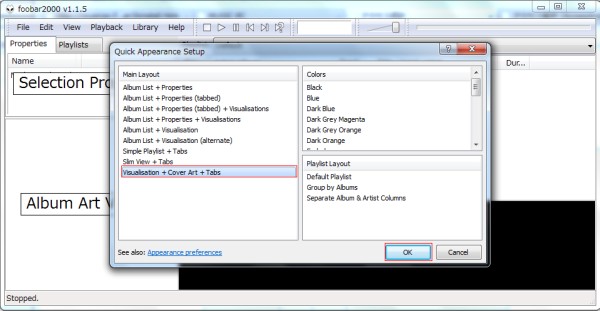 ここではジャケット表示したいので「Visualisation + Cover Art + Tabs」を選択します。