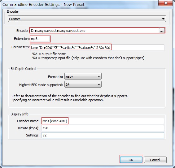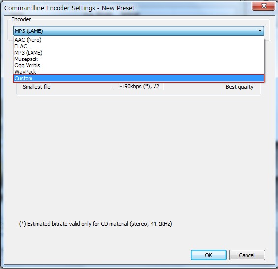 エンコーダの選択ですが、EasyWavPack経由でLAME変換しますのでCustomを選択します。