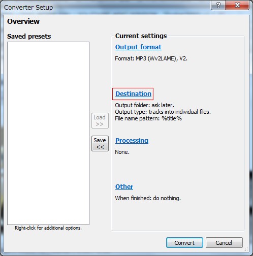 Converter Setupに戻ってくると思いますので次はDestination(保存設定)をクリックします。