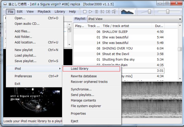 「File」−「iPod」−「Load library」をクリックするとiPod等の端末に入っている