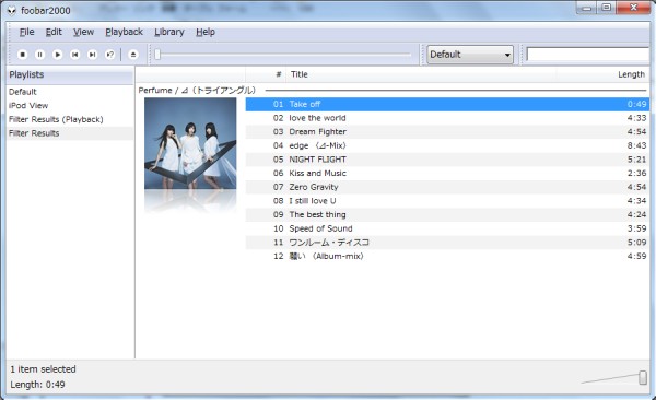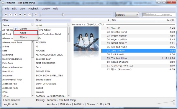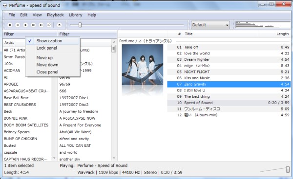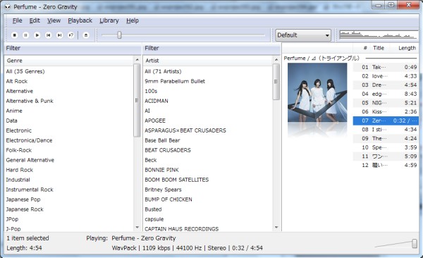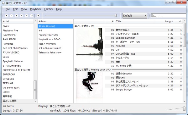 プレイリストにはWavPackに埋め込んだアルバムジャケット、曲リストが表示されています。