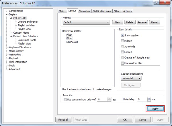 「File」−「Preference」の「Display」ー「Columns UI」の「Layout」タブを開きます。