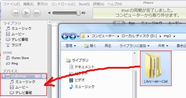 それでは転送してみます。iTunesのデバイスのところへ変換したMP3ファイル(フォルダ)